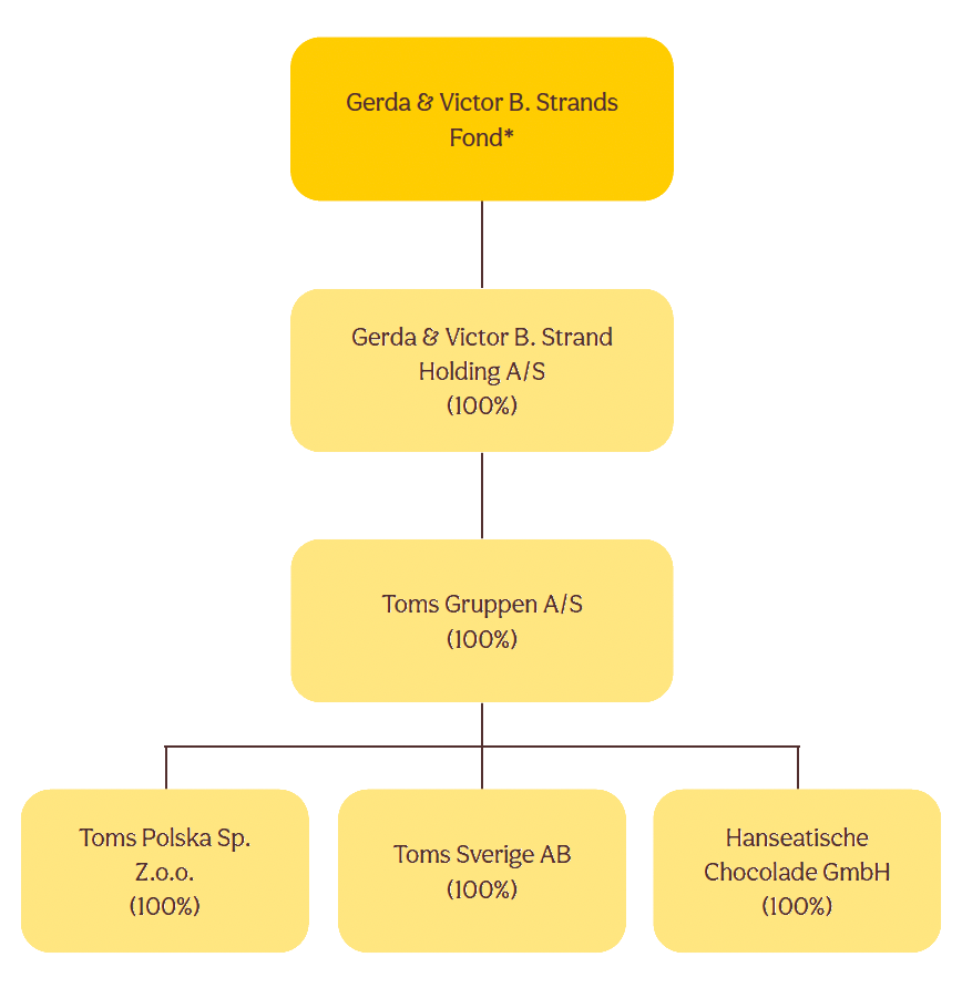 Gerda og Victor B. Strand Holding A/S is a holding company. Toms Gruppen A/S manufactures, markets and sells confectionary.
